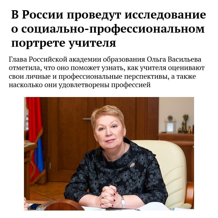 Глава Российской академии образования Ольга Васильева отметила, что оно поможет узнать, как педагоги оценивают свои личные и профессиональные перспективы, а также насколько они удовлетворены профессией