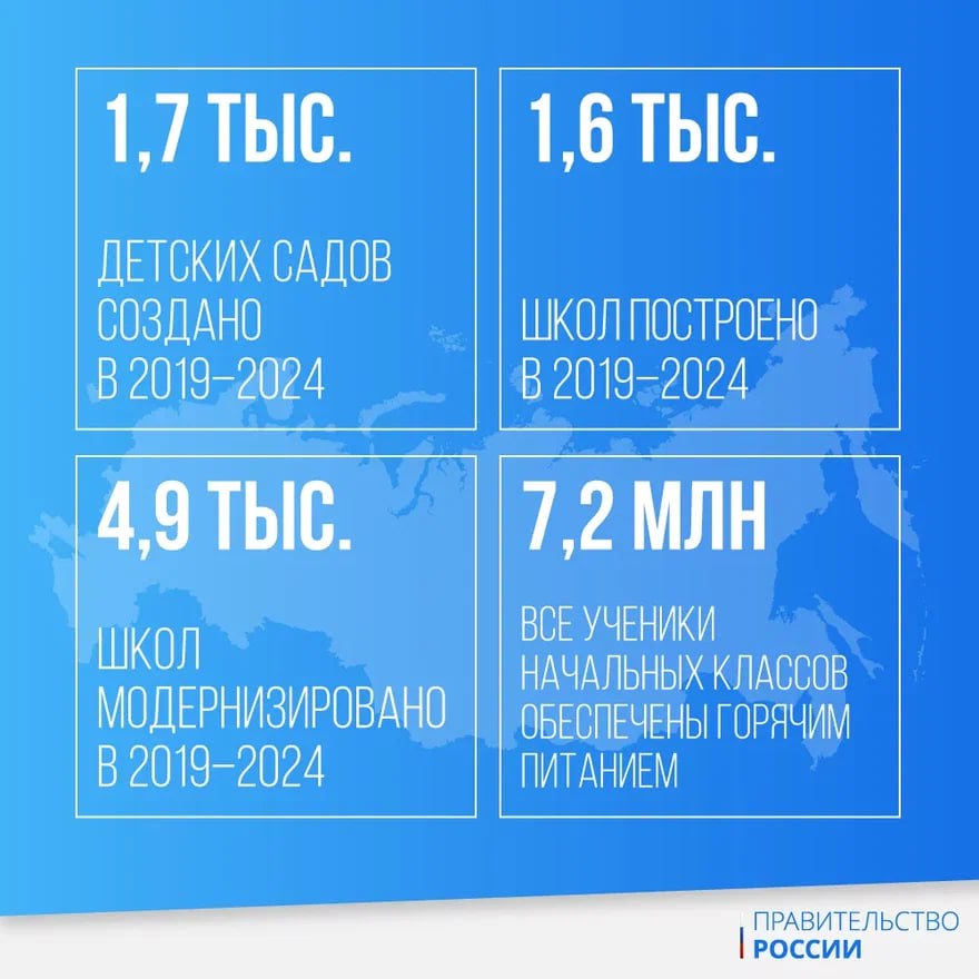 🏫В рамках нацпроектов по всей стране создано более 1,7 тыс. детских садов. Построено более 1,6 тыс. школ, 4,9 тыс. школ модернизировано. Более 7 млн учеников начальных классов получают бесплатное горячее питание.