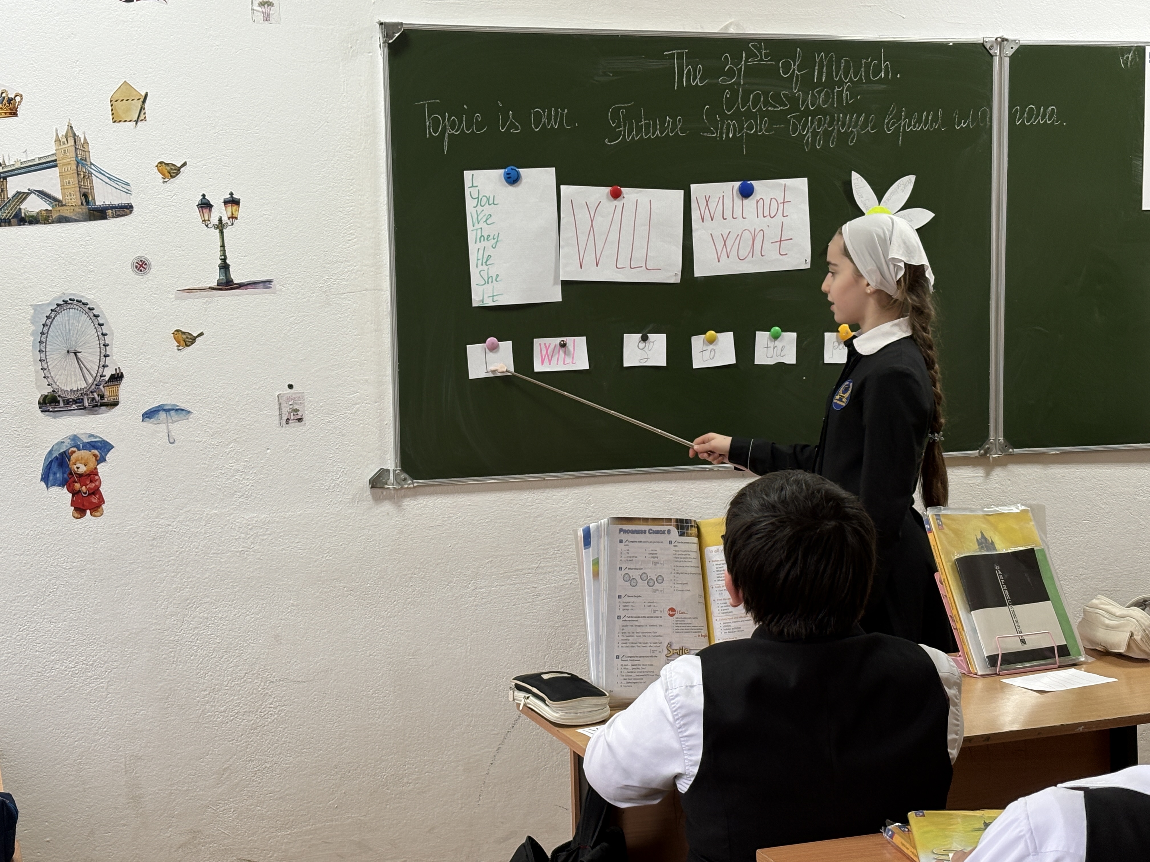 31.03.2026Сегодня на уроке английского языка ученики 5 "Б" класса начали наше путешествие в мир будущего. мы узнали как строить предложения в будущем времени используя глагол WILL. Ребята активно составляли свои предложения о будущем времени. Отвечали на вопросы учителя показывая свои карточки с утверждениями "будут" и "не будут" они это делать